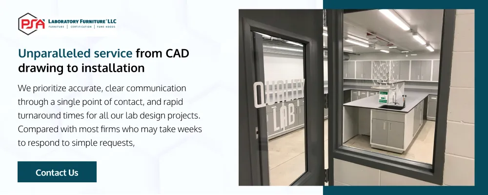 PSA Laboratory Furniture is your trusted laboratory furniture supplier in the United States. Our range includes durable laboratory cabinets, fume hoods, and stainless countertops that meet any lab environment’s specific needs. With our custom laboratory furniture and specialized lab equipment, we provide solutions to optimize your laboratory infrastructure. From lab design and installation services to lab ergonomics and safety equipment, our end-to-end solutions can enhance productivity and safety in your workspace. Trust us for all your laboratory furniture and equipment needs.